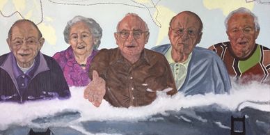 Guenter, Ilse, Henry, Heinz and Fred are all Holocaust Survivors who eventually found their way to the same San Francisco Jewish Community after the war. Their synagogue was nicknamed the Shanghaii synagogue as many there survived the war as refugees in Shanghaii. The background of this painting maps their unique journeys to San Francisco. The painting is currently on loan to the synagogue.